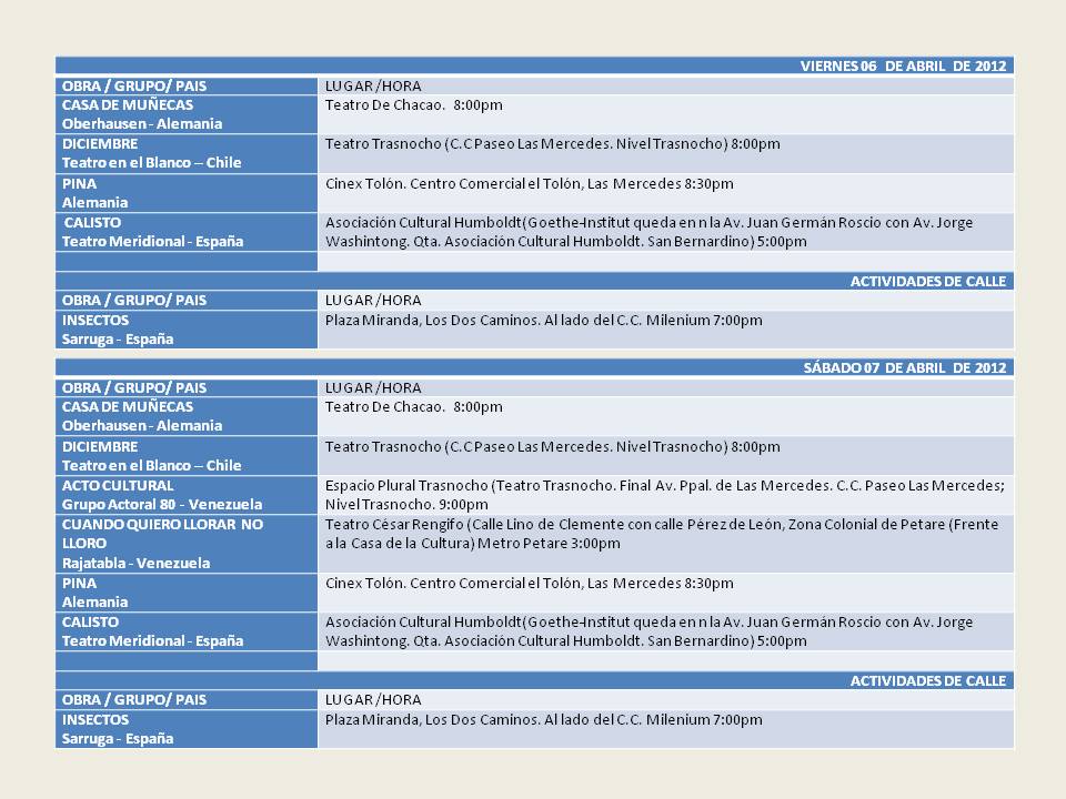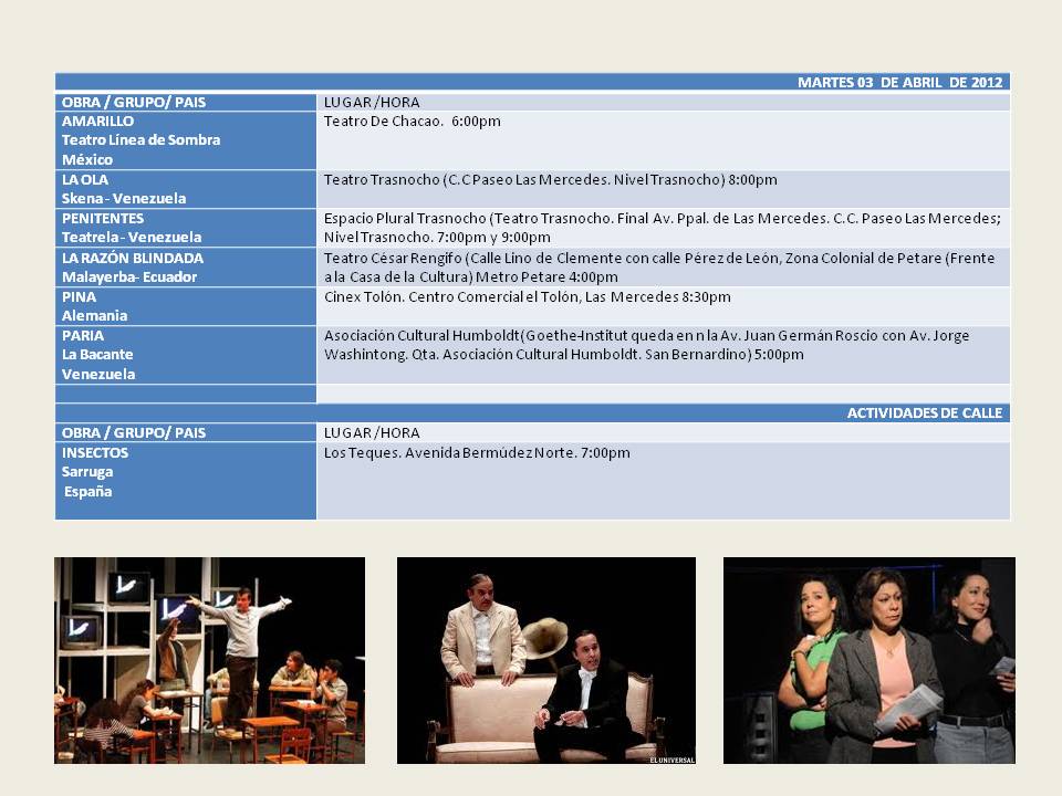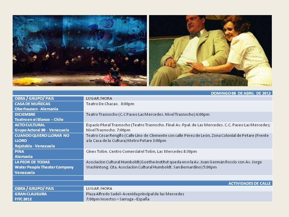 Pero superando esas dificultades, como decíamos al principio, Carmen Ramia ha logrado junto a su equipo, volver a montar el muy añorado Festival Internacional de Teatro de Caracas en esta edición 2012.