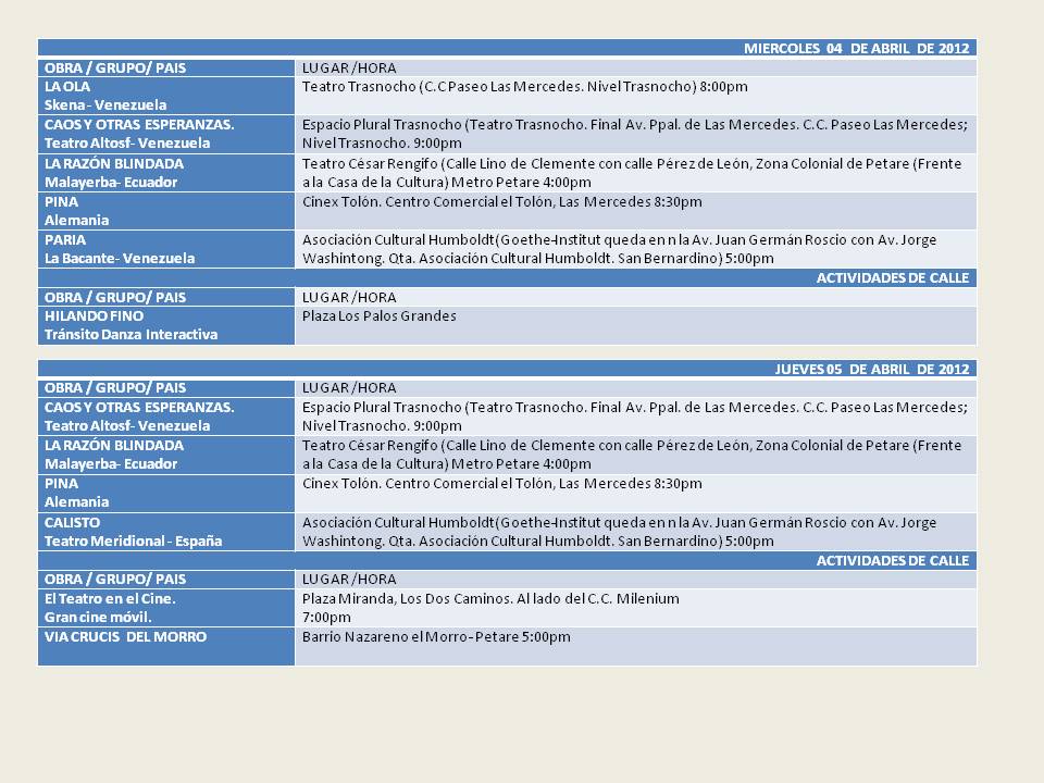 Vienen grupos del exterior evidentemente, pero también cualquier cantidad de grupos de nuestro país, por ejemplo tenemos “Señoras de Maracaibo”, la oralidad y corporeidad de la mujer marabina de las populosas barriadas de los años sesenta y setenta, se exponen bajo el recurso del travestismo teatral, en un montaje donde la tragedia y la comedia se conjugan para dar una demostración de la memoria de nuestros pueblos.