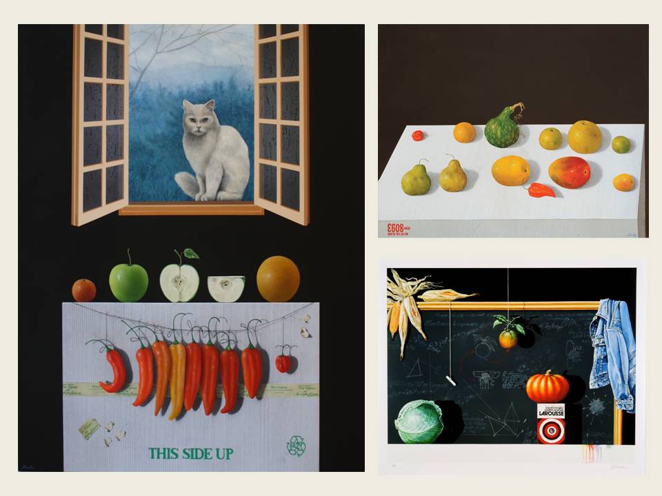El tema del bodegón recobra vigencia en esta exposición. Hay obras de grande, mediano y pequeño formato y vuelve el maestro Dávila a jugar con sus cajas, las frutas, algunas peladas, picadas por la mitad. También se observan los gatos. Los gatos que siempre miran de frente y con cierto aire escrutador al que observa la pintura.