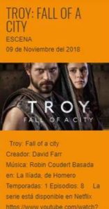 «Troy: Fall of a City» es una serie británico-americana basada en la Guerra de Troya y la historia entre París y Helena. Esta ambientada en el siglo 13 a. C, y repasa el asedio de 10 años a la ciudad de Troya. La serie es una coproducción entre la BBC One y Netflix.