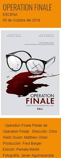 «Operation Finale» es una película estadounidense de drama histórico del 2018, dirigida por Chris Weitz y escrita por Matthew Ortony protagonizada por Oscar Isaac, Ben Kingsley, Lior Raz, Mélanie Laurent, Nick Kroll y Joe Alwyn. Sigue los esfuerzos de los soldados de inteligencia israelí para encontrar y capturar al oficial de la SS Adolf Eichmann, en Argentina, en 1960.