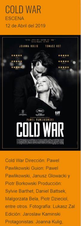 Cold War es una película polaca de 2018 dirigida por Paweł Pawlikowski. Fue la gran triunfadora de la 31ª edición de los Premios del Cine Europeo.