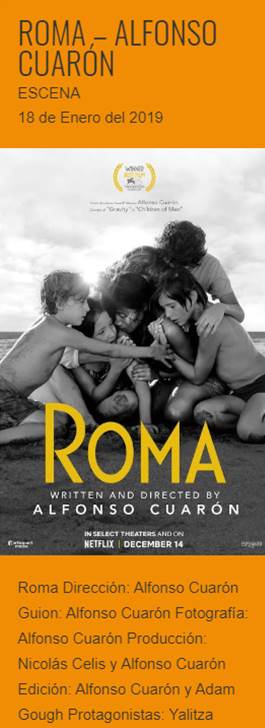 Roma es una película dirigida, escrita, fotografiada y coproducida por Alfonso Cuarón. Fue estrenada en el 2018 y estuvo nominada a diez premios Óscar, de los cuales obtuvo tres.