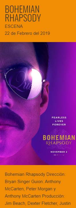 Bohemian Rhapsody es una película biográfica de 2018 sobre el cantante británico Freddie Mercury y el grupo de rock Queen. Fue dirigida por Bryan Singer, aunque Dexter Fletcher asumió el cargo de director las últimas semanas de rodaje tras el despido de Singer. Obtuvo cuatro Óscars, dos Globos de Oro y dos BAFTA.