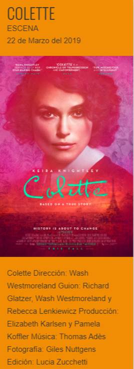 Colette es una película biográfica de drama de 2018, dirigida por Wash Westmoreland, escrita por Westmoreland y Richard Glatzer, basada en la vida de la novelista francesa Colette.