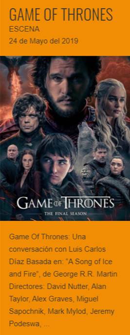 Game Of Thrones es una serie de televisión de drama y fantasía medieval creada por David Benioff y D. B. Weiss y producida por la cadena HBO. Su argumento está inspirado en la serie de novelas Canción de hielo y fuego, escrita por el estadounidense George R. R. Martin. Es la serie con mayor cantidad de galardones Emmy en la historia de la televisión, con 59 en total.