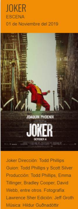 Joker es una película de suspense y drama psicológico estadounidense de 2019 distribuida por Warner Bros. Pictures y basada en el Joker, personaje de DC Comics.