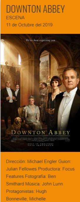 Downton Abbey es una película dramática de 2019, escrita por Julian Fellowes, creador y escritor de la serie de televisión del mismo nombre, producida por Gareth Neame, Liz Trubridge y Fellowes, y dirigida por Michael Engler.