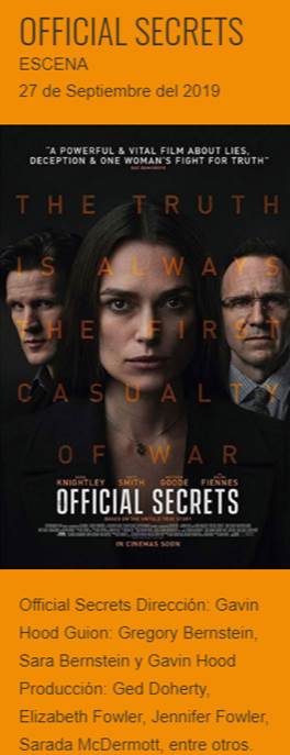 Official Secrets es una película de docudrama británico-estadounidense de 2019 basada en la vida de la denunciante Katharine Gun, quien filtró un memorando que detallaba que Estados Unidos había escuchado a diplomáticos de países encargados de aprobar una segunda resolución de las Naciones Unidas sobre la invasión de Irak.