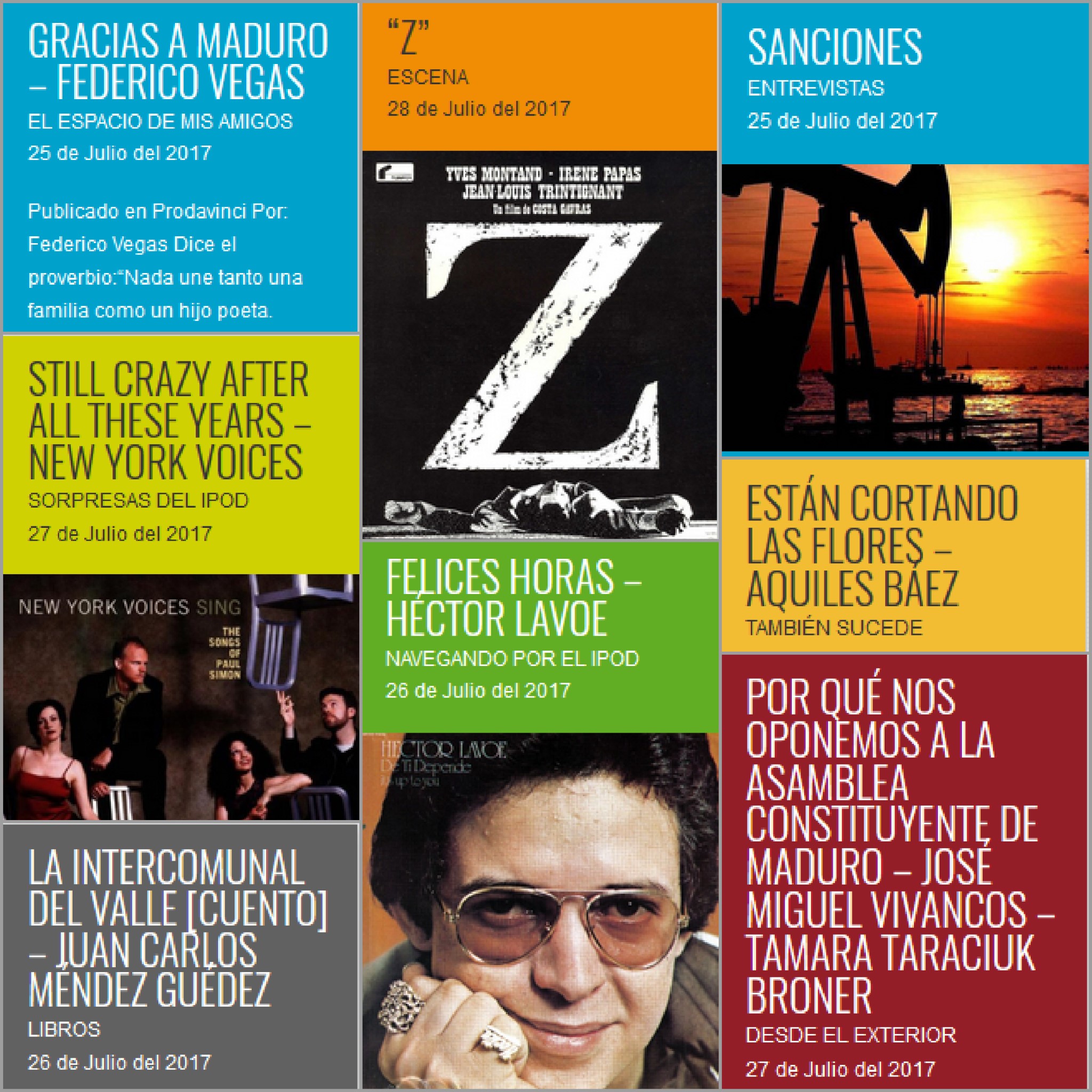 CompartirTweetPin itCompartirEmailMás Entre «Gracias a Maduro» y «Por qué nos oponemos a la Asamblea Constituyente de Maduro» Por Mayra Villavicencio30 julio, 201729 julio, 2017 0 GRACIAS A MADURO – FEDERICO VEGAS FELICES HORAS – HÉCTOR LAVOE SANCIONES – ENTREVISTAS STILL CRAZY AFTER ALL THESE YEARS – NEW YORK VOICES LA INTERCOMUNAL DEL VALLE (CUENTO) – JUAN CARLOS MENDEZ GUEDEZ ESTÁN CORTANDO LAS FLORES – AQUILES BÁEZ «Z» – EN ESCENA POR QUÉ NOS OPONEMOS A LA ASAMBLEA CONSTITUYENTE DE MADURO – JOSÉ MIGUEL VIVANCOS – TAMARA TARACIUK BRONER