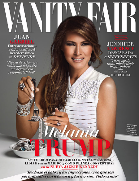 Y, hablando de valores, así como semidesnuda en el avión la señora Trump se recrea con un maletín repleto de joyas, recientemente, en el vilipendiado y odiado México de su esposo, la revista Vanity Fair publica su edición más reciente donde la vemos comiendo espaguetis, desayunando espaguetis. Pero el detalle está en que que no es pasta italiana la que Melania, con cuchara y tenedor, se lleva a la boca. Lo que hay son ristras de diamantes, un enredo de pulseras llenas de joyas relucientes.