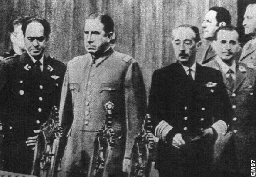 Los pioneros en el arte del comunicado del golpe de Estado fueron el general Augusto Pinochet y los miembros de su junta en Chile en septiembre de 1973.
