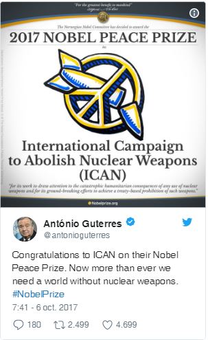 La Campaña Internacional para la Abolición de las Armas Nucleares, Nobel de la Paz 2017