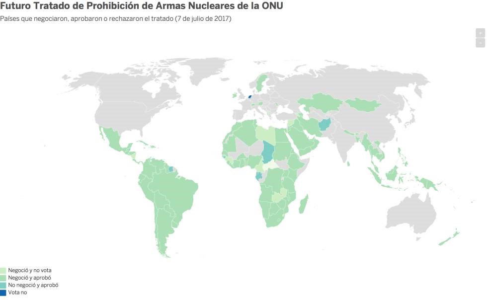 El texto del Tratado sobre la Prohibición de Armas Nucleares fue aprobado en julio en la ONU con 122 votos a favor y uno en contra, el de Holanda. Más de un tercio de los Estados miembros se abstuvo, entre ellos las nueve potencias nucleares y todos los miembros de la OTAN, con la excepción holandesa. El tratado, que entrará en vigor 90 días después de que 50 países completen su proceso de ratificación, cuenta hasta ahora con 53 firmantes y únicamente ha sido ratificado por Tailandia, Guyana y el Vaticano.
