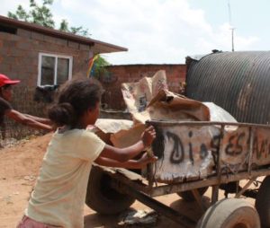 Hace un año que no va a la escuela. “Estaba en tercer grado, pero como el burro se murió, tuve que trabajar y dejar las clases”, dice con nostalgia. Vive en el barrio Brisas del Morichal, en el oeste de la ciudad, en una de las parroquias más pobres de Maracaibo, con casas a medio terminar, sin agua, “con luz de contrabando”, sin gas. “Aquí no hay nada”.