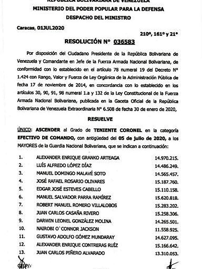 La respuesta que Nicolás Maduro parece darle a ese informe sobre Venezuela, de la Alta Comisionada de los Derechos Humanos de la Organización de las Naciones Unidas, es ascender a uno de los principales agentes de violación de derechos humanos de la Dirección General de Contrainteligencia Militar, el ahora coronel de la Guardia Nacional Bolivariana Alexánder Enrique Granko Arteaga, egresado de la II Promoción “Batalla Mata de La Miel”, de la EFOFAC, año 2003, como primer brigadier y alférez auxiliar.