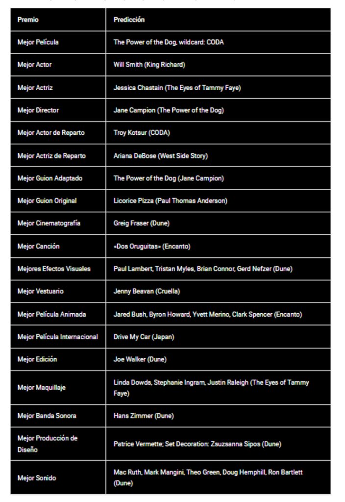 Volviendo al evento que nos convoca. En cuanto al premio de la noche (Mejor Película) este año se parece bastante a 2020 (https://www.lagranaldea.com/2020/02/07/predicciones-oscar2019/), donde “1917” y “Parasite” parecían empatar hasta el último minuto. En este caso, la contienda está entre “The Power of the Dog”, la película escrita y dirigida por Jane Campion y producida por Net ix; y “CODA”, la película escrita y dirigida por Sian Heder y distribuida por Apple.