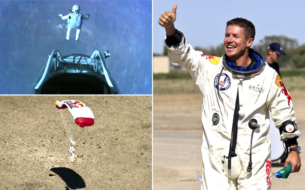 En la imagen que tenemos cuando él salta de la capsula, muestra a la tierra en esa especie de dimensión azulada que tiene nuestro planeta cuando lo empezamos a ver desde afuera. Y el hombre al mero vacío fue a parar. Llegó a alcanzar, solo en su cuerpo, la velocidad máxima de 1.342 Km por hora, es decir casi 100 km más que la velocidad del sonido, con lo cual rompió la barrera -la explosión la habrá oído el solo-, y de repente empezó a sufrir convulsiones, a dar vueltas y vueltas. Cuando apenas le faltaban 1000 metros bajando a esa velocidad -¡imagínese usted, a esa velocidad de 1.342 Km por hora, y él se lanzó a una altura de 39 Km!-, es que decide abrir el paracaídas; ya había logrado entrar en control de todo.