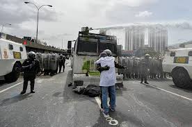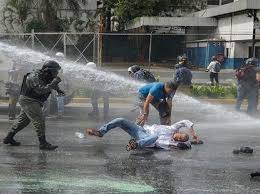 me hizo sentir que fue un estímulo realmente compasivo hacia mí, porque sabía lo que me iba a pasar… Le dije que no podía porque yo venía con ellos –con los manifestantes- y queríamos pasar. Entonces fue ahí cuando lo agarré por segunda vez y le dije: ¡No nos peguen, no nos agredan! Y me dice: “Por favor, ven conmigo.” Yo le dije que no podía y me separé. Al separarme sentí inmediatamente en la región toráxica el impacto. El impacto que me derriba y me desorienta. Cuando me doy cuenta veo a una periodista caída al lado mío. Lo primero que vi fueron sus cámaras destrozadas totalmente. Empecé a buscar mis lentes que los perdí, la gorra… Y mis compañeros que me agarraron. Entonces empezaron a tirarnos más bombas. Yo caído y caían más bombas y más bombas.