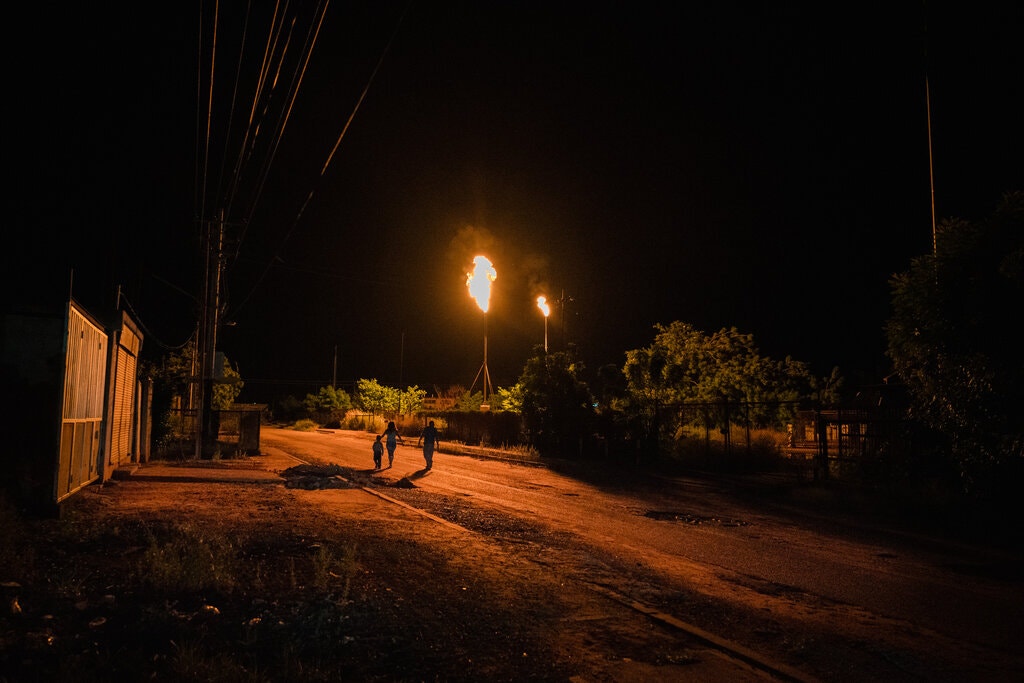 Los pozos que alguna vez explotaron las mayores reservas de crudo del mundo están abandonados o los dejan para que emitan gases tóxicos que arrojan un brillo anaranjado sobre las ciudades petroleras en crisis.