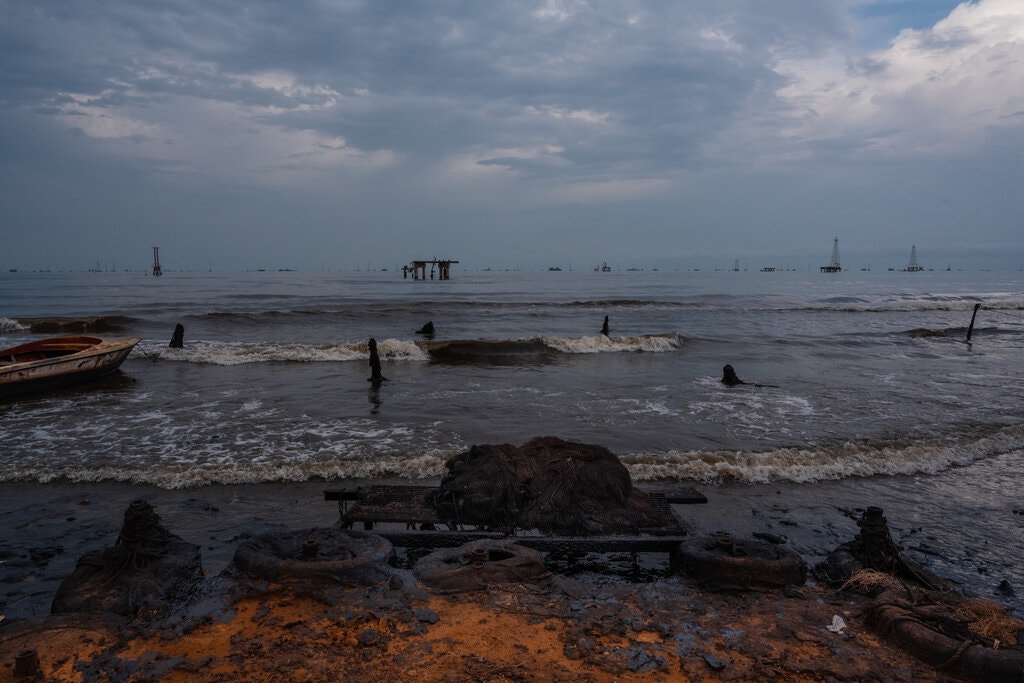 En Cabimas, una ciudad a orillas del lago de Maracaibo, que alguna vez fue el centro de producción de los prolíficos campos petroleros de la región, el crudo que se filtra de los pozos y oleoductos submarinos abandonados recubre los cangrejos que los extrabajadores petroleros sacan del lago con las manos ennegrecidas.