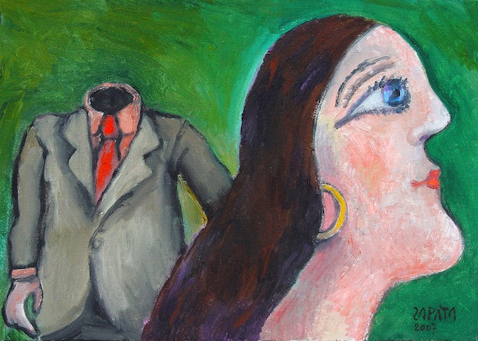 ¿Pero por qué a Zapata le interesa el bolero? Por lo que sus cuadros nos dicen, quizá por esa suerte de desafío extremo, falsamente final, que supone el bolero. Porque éste planta un drama de dimensiones colosales y operáticas (la otra parte de esta exposición, detalle nada gratuito, obviamente) en esa pequeña parcela de nuestra anónima cotidianidad. Es el drama hondo, desgarrado, aparentemente irreversible e insuperable, del oficinista y la bioanalista, del estudiante y del abogado modesto y ojeroso en tribunales, del policía y la arepera, del doctor en su pedestal y su resignado paciente también; de todos, pues, que caemos en la trampa de pensar que, en la pena de amor, el mundo se nos puede acabar mañana. Ese hombre, pues, pintado allí, que por corazón sólo tiene una mancha negra y le abre los brazos a una mujer -la misma, otra vez-, siempre indiferente. Semejante exageración, obviamente, abre las puertas al humor. Y allí el genio de Zapata hace de las suyas. Una sonrisa siempre es preferible ante el desgarro del desaliento. Una herramienta fácil y rápida para evitar que la pena nos aplaste.