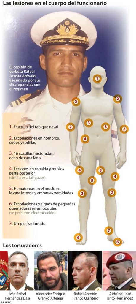 El capitán de corbeta venezolano Rafael Acosta Arévalo murió mientras era torturado por miembros de la Inteligencia chavista que actuaban con pleno conocimiento de Nicolás Maduro. La autopsia realizada al cadáver del militar reveló que la causa de su muerte fue «un edema cerebral severo debido a la insuficiencia respiratoria aguda producida por la rabdomiólisis por politraumatismo generalizado» (la rabdomiólisis es un síntoma que presentan las víctimas de terremotos, bombardeos y derrumbes de edificio), y «tiene entre sus causas el aplastamiento», según explicó la abogada de derechos humanos, Rocío San Miguel.