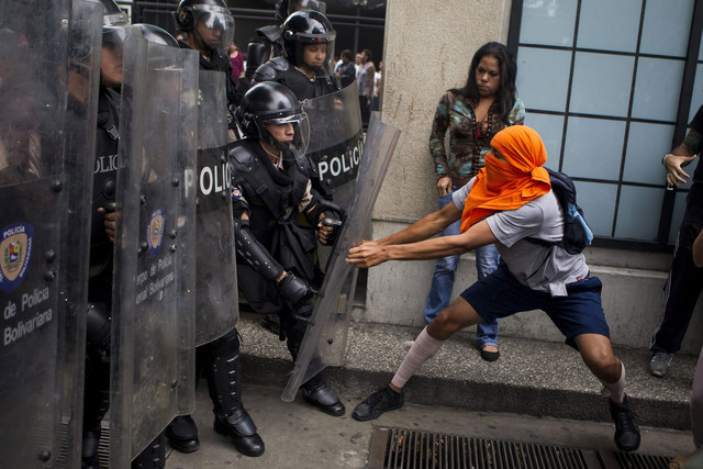 Protestors clash with police in Caracas in May. At least 43 people have died this year during anti-government rallies. Photographer: Miguel Gutierrez/Landov