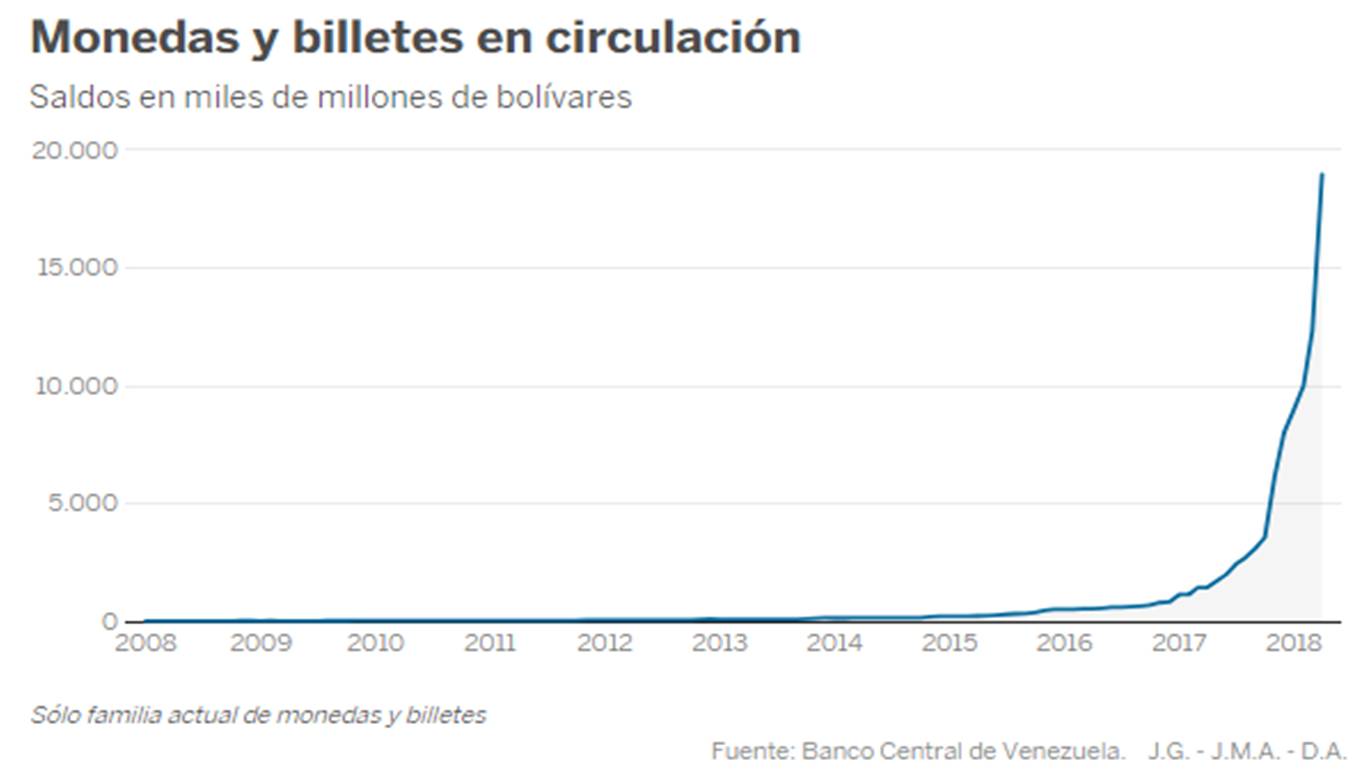 A pesar de la falta de claridad, fuentes oficiales ofrecen un indicio claro de que la inflación crece sin freno. El Banco Central de Venezuela actualiza el número y el valor de las monedas y billetes en circulación. En abril, ese metálico equivalía a casi 19 billones de bolívares. En el mismo mes de 2017, eran 1,4 billones, y un año antes, en abril de 2016, solo medio billón. La máquina de hacer billetes funciona a un ritmo frenético.
