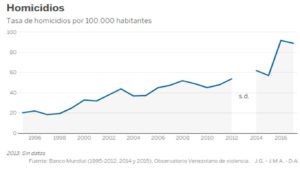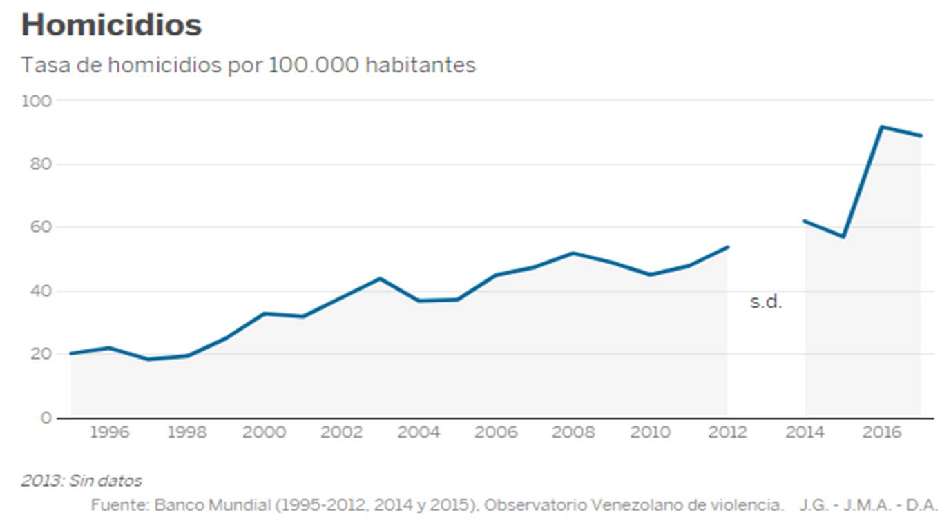 A esta situación se suma la violencia en el país, singularmente en las ciudades. Caracas es la segunda más violenta del mundo, solo superada por Los Cabos (México). Otra urbe venezolana, Guayana, es la novena más peligrosa. La tasa de homicidios del país cuadriplicó en 2017 la de 1995. La impunidad que pende sobre muchos crímenes agudiza el problema. Según un informe del Ministerio Público venezolano presentado al Parlamento, recogido por Amnistía Internacional, en 2015 se registraron más de 11.000 denuncias de crímenes de derecho internacional y violaciones de derechos humanos. Sin embargo, durante aquel año solo se iniciaron 77 juicios.