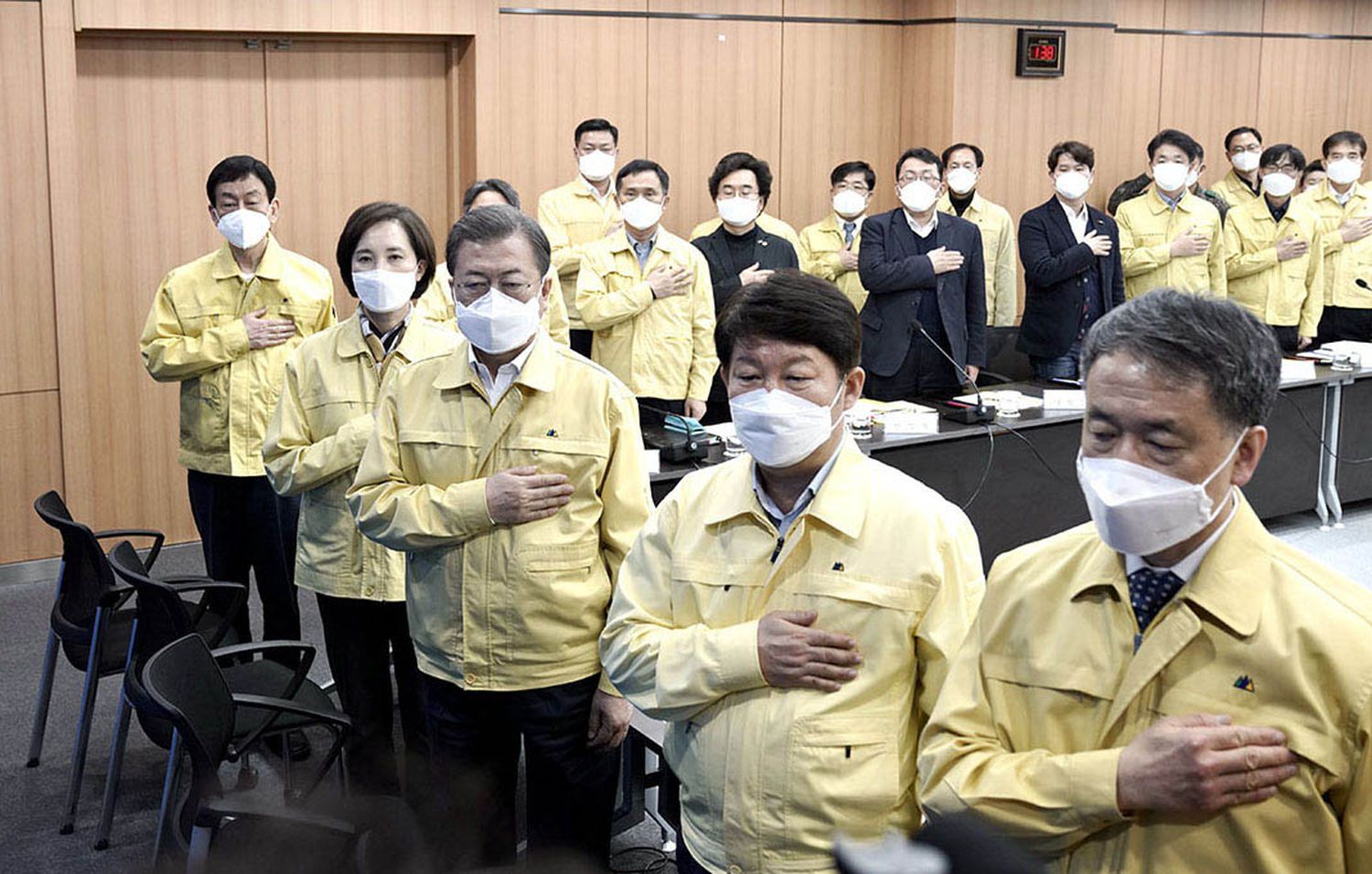 El presidente de Corea del sur, el tercero por la izquierda, el pasado 25 de febrero en el Ayuntamiento de Daegu.