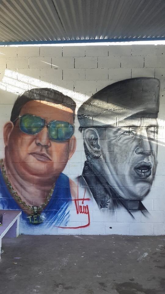 Esa cárcel de Margarita, gracias a los “buenos oficios” de este individuo, “El Conejo”, es un spa –como podría definirlo Cabello-, con piscina y demás. Pero llama inmensamente la atención un muro donde está pintado, en grande y a todo color, el delincuente en cuestión. Y por si fuera poco, más insólito aún es que a su lado, pintado también muy grande pero en blanco y negro, como si estuviese velando y protegiendo a El Conejo, está Hugo Chávez.