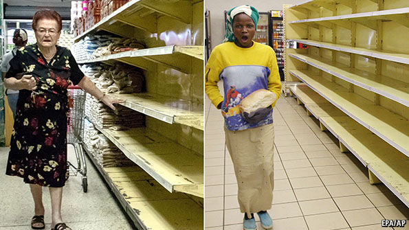 Otras fotografías. Estas son dos que parecen la misma. A la izquierda una señora, también de avanzada edad, camina hacia cámara apoyándose en los anaqueles vacíos de un supermercado. A la derecha una foto casi gemela. Avanza a cámara una mujer, esta más joven, de intensa tez negra en comparación con la blanca señora de la anterior. Pero lo importante es que ella también camina entre los anaqueles vacíos de un supermercado. Las dos fotografías fueron publicadas ayer por la revista británica The Economist. Hay un detalle, la foto de la izquierda -la de la señora mayor- fue tomada en Caracas, recientemente; la de la derecha –la de la joven- fue tomada en Zimbabwe quince años atrás. Y el titular más penoso no puede ser: “Venezuela hoy luce como Zimbabue hace 15 años”. Y citan: “El Fondo Monetario Internacional pronostica una inflación del 720% para este año en Venezuela. Esa fue la cifra de inflación que tuvo Zimbabwe en el año 2003”.