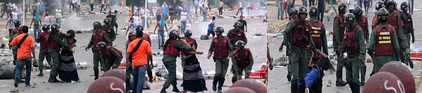 La mujer de la Guardia Nacional se monta a horcajadas sobre ella, de manera tal de aprisionarla totalmente, en una actitud, por decir lo menos, humillante y peligrosa. Por si fuera poco, se quita entonces el casco y, sin ocultar una sonrisa perversa, cargada de morbo, de odio, empieza a golpear con el casco a la mujer que está tendida en el piso, inerme, indefensa. Esto ante la pasiva mirada de unos seis o siete compañeros de la mal llamada Guardia del Pueblo.