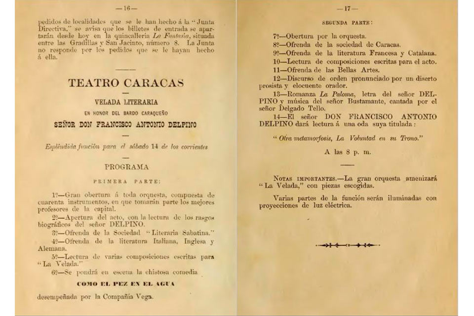Un par de tweets del compatriota Oswaldo Guerreiro (@ojguerreiro) en los que mostraba tanto el “afiche” como el programa del homenaje que se rindió el 14 de marzo de 1885 en el Teatro Municipal de Caracas al “poeta desquiciado” –como lo alude una reseña de Olga Santeliz–, Francisco Antonio Delpino y Lamas, invitan a reflexionar sobre ese gran acontecimiento humorístico, con indiscutibles consecuencias políticas para el país, que constituyó La Delpiniada.
