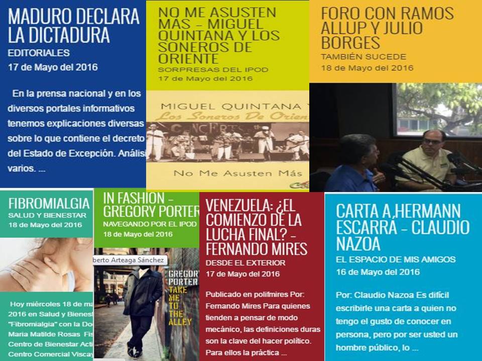 Entre «Maduro y la Carta» y «Ayudando a Maduro» Por Ana ForeroPlaylist de la Semana5 junio, 2016 Los invito a disfrutar de #ElPlayListdelaSemana: Entre «Maduro y la Carta» y «Ayudando a Maduro» MADURO Y LA CARTA AGUAS…