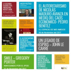 De ¿Agotados y Vencidos? de Elías Pino Iturrieta hasta Beneficios del Chocolate para el Cerebro Por Daniel GonzalezPlaylist de la Semana3 diciembre, 2017 ¿Agotados o Vencidos? – El Espacio de mis Amigos Más carne y hueso, más luz y píxeles – Desde El Exterior …